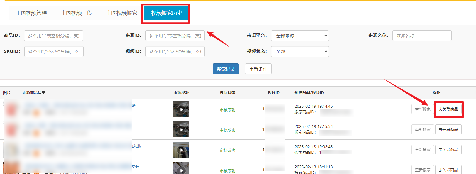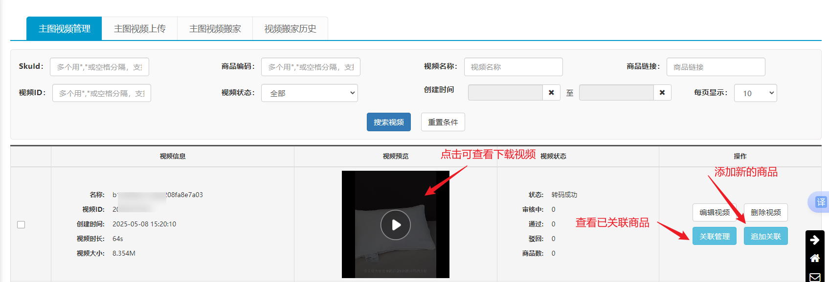点击“视频搬家历史”页面下的“去关联商品”