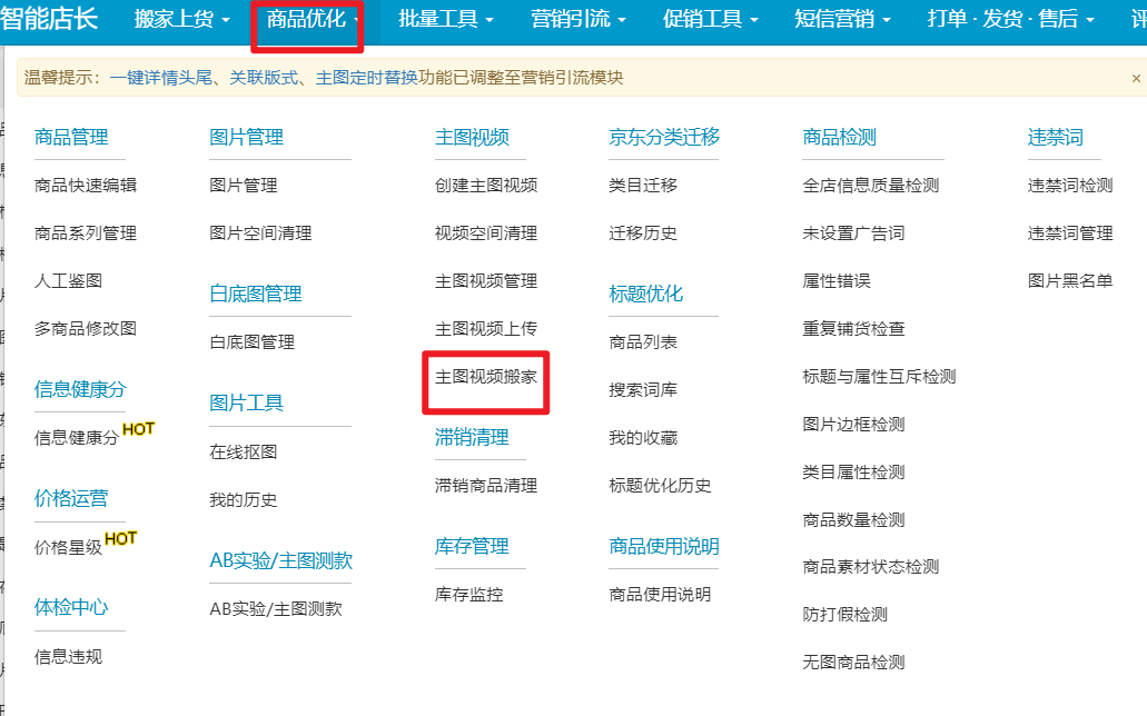 点击进入商品优化,选择主图视频搬家