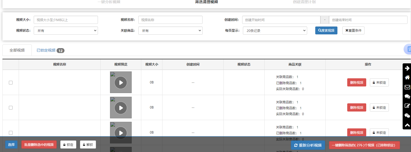 可根据条件筛选视频,勾选不满意的视频批量删除