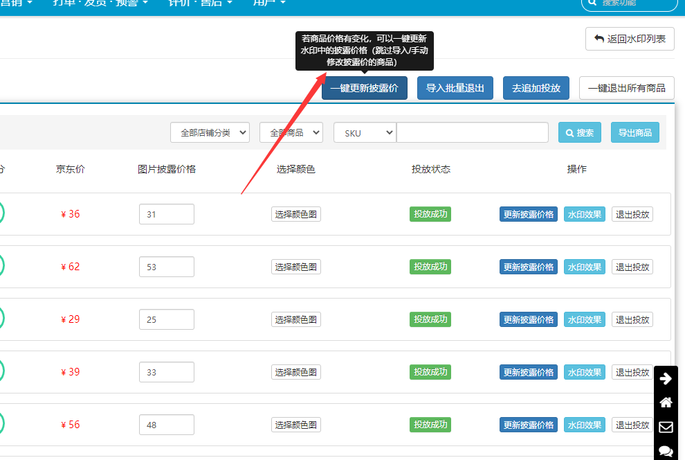 在顶部选择【一键更新披露价】即可快速对商品进行价格修改。