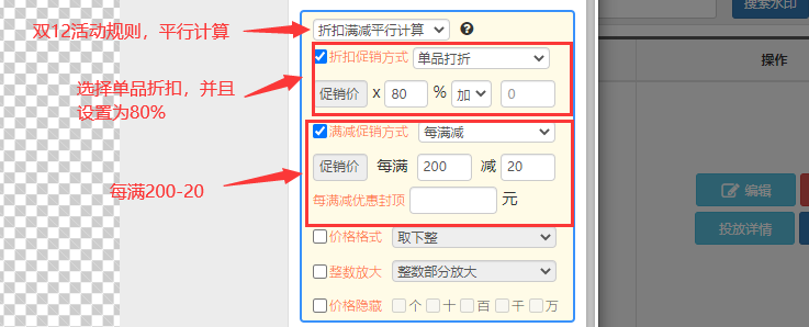 例子:双12大促,每满200-20,并且商品打8折,如下图设置: