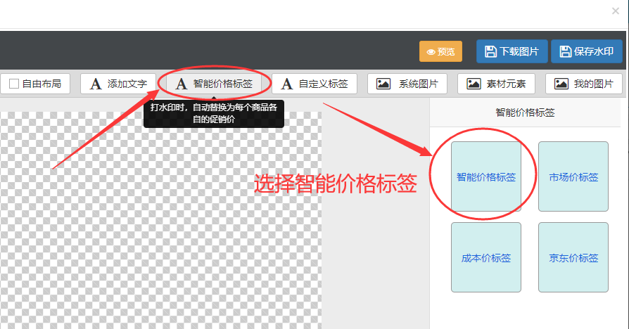 在水印编辑器中,选择智能价格标签,我们看到有四个选择:智能价格标签、市场价标签、成本价标签、京东价标签;
