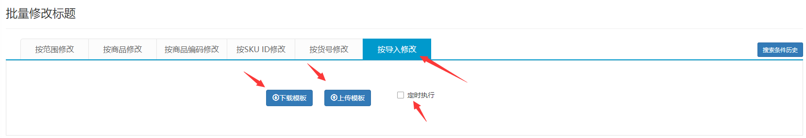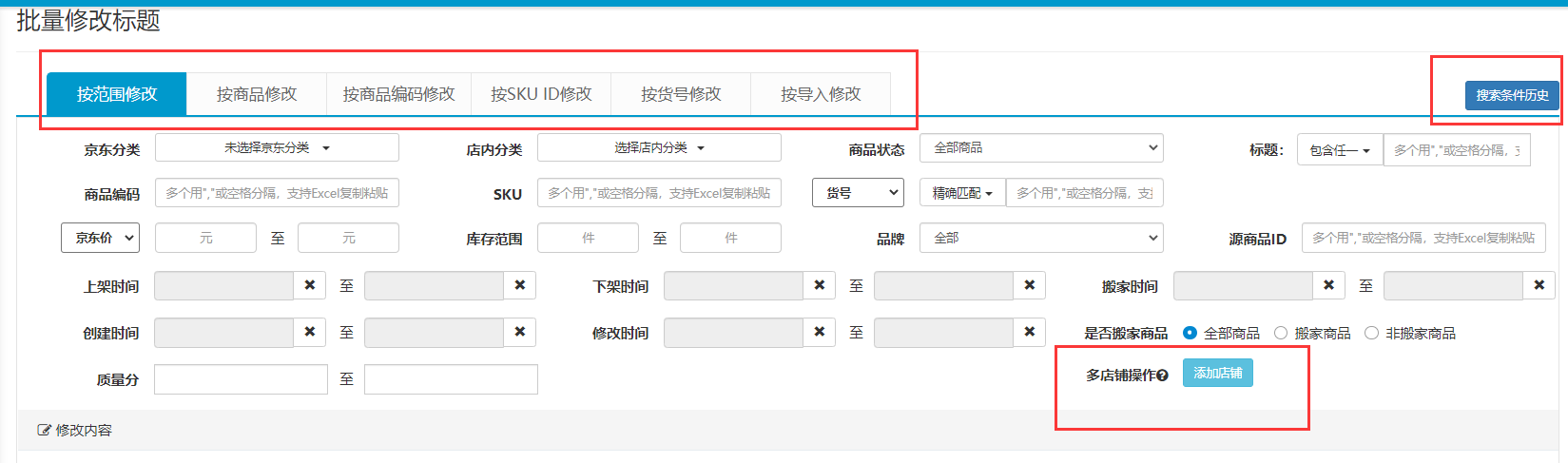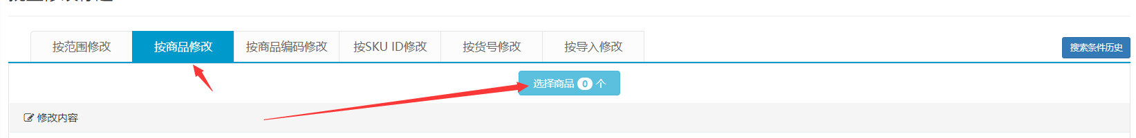 主要分为:按范围修改;按商品修改;按商品编码修改;按skuid修改;按货号修改;按导入修改