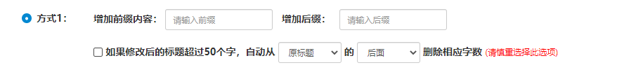 方式1:在原有标题基础上,给一个或者多个商品在标题前面以及后面批量添加关键词,因为平台对于标题有50个字符的限制(特殊类目除外),所以需要勾选如果修改后的标题超出50个字,您希望从哪删除掉字数来腾出空间哦。
