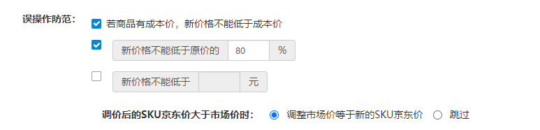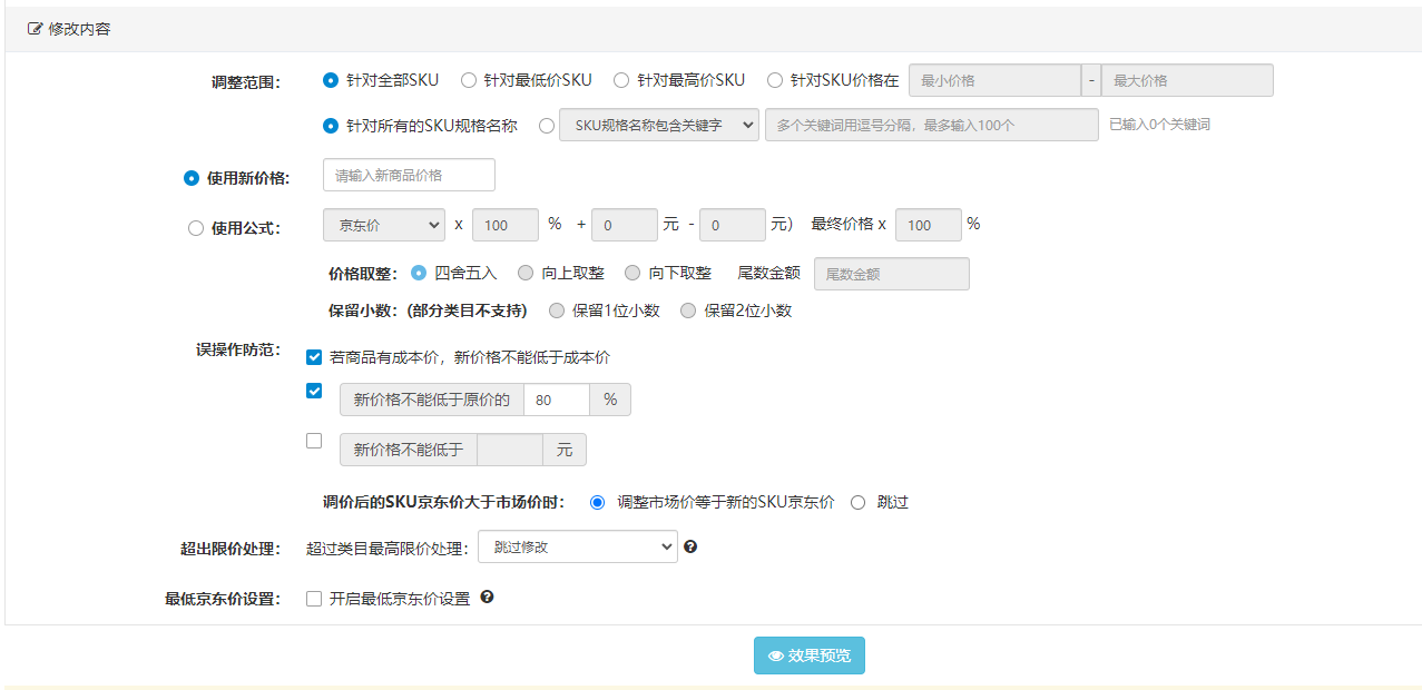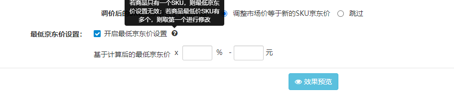 最低京东价设置:这是针对多sku的情况,若商品有多个sku,取最低京东价的sku再进行计算,如果最低价sku有多个,则取其中的第一个sku进行修改。