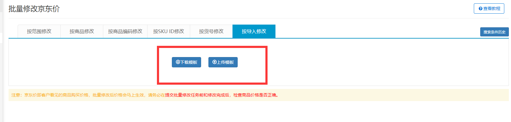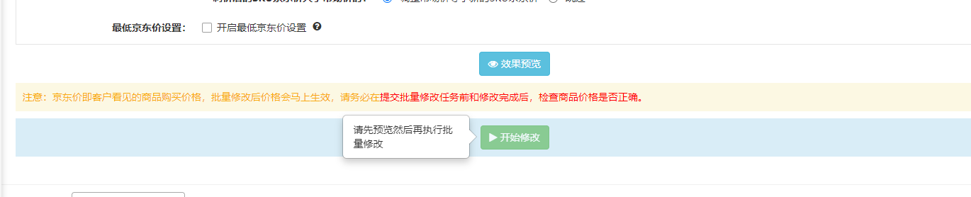 注意:京东价即客户看见的商品购买价格,批量修改以后价格马上更新生效,请谨慎修改,务必在提交批量修改任务前,再次检查预览中的商品价格是否正确。