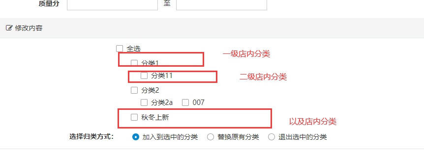 (比如分类1->分类11,如果只有一级店内分类的话,就写一级类目就行,比如下例的秋冬上新就是一级分类),多个支持分号隔开;