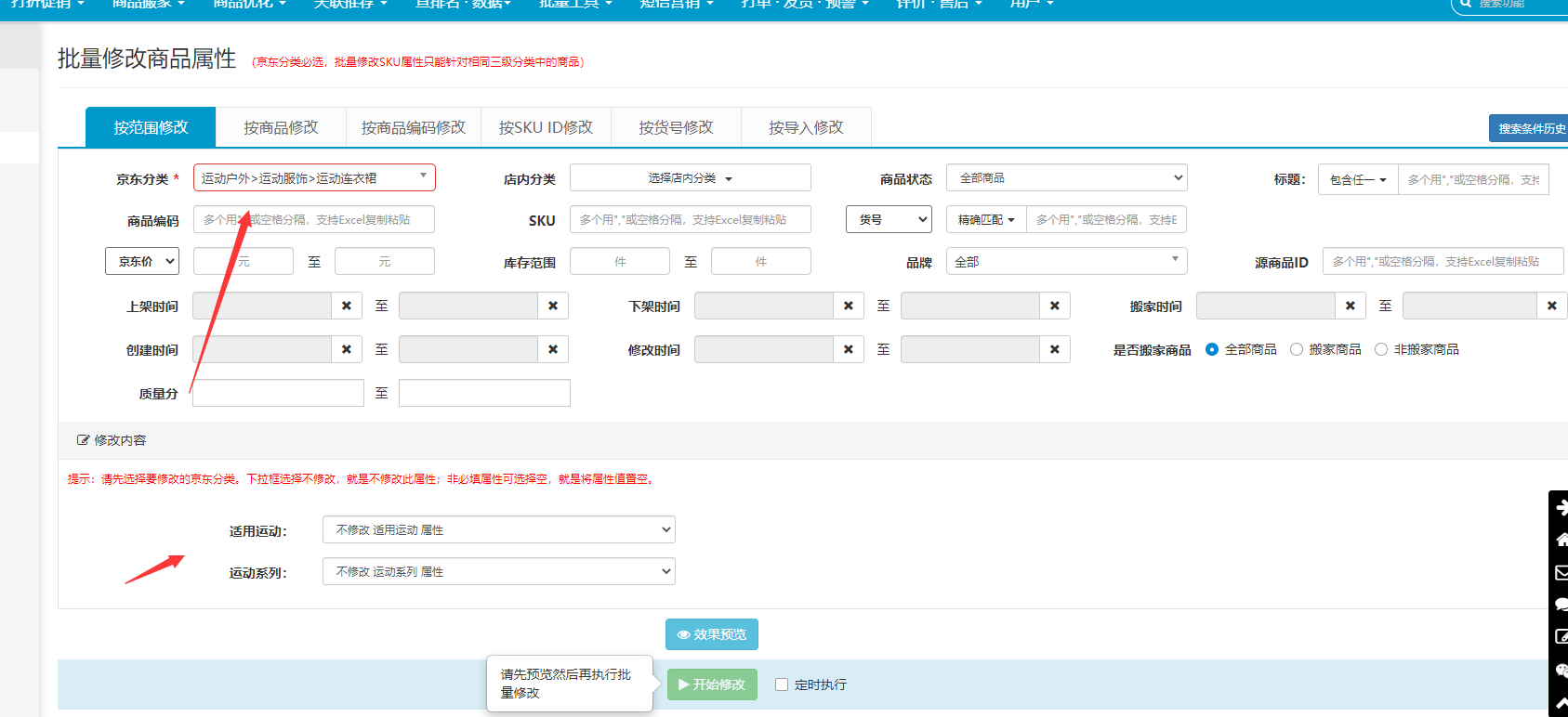 按范围修改:这个适合大量并且统一的商品,比如全店商品修改,或者选择京东分类里面其中的某个或者某几个的类目商品等等筛选条件。