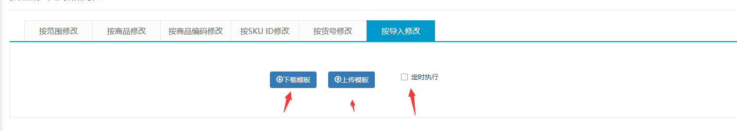 主要分为:按范围修改;按商品修改;按商品编码修改;按skuid修改;按货号修改;按导入修改