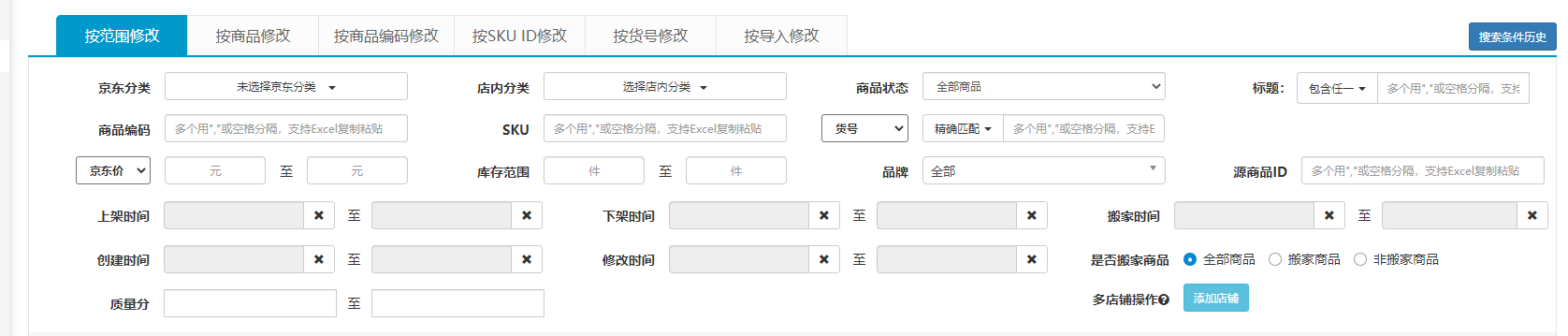 按范围修改:这个适合大量并且统一的商品,比如全店商品修改,或者选择京东分类里面其中的某个或者某几个的类目商品等等筛选条件。