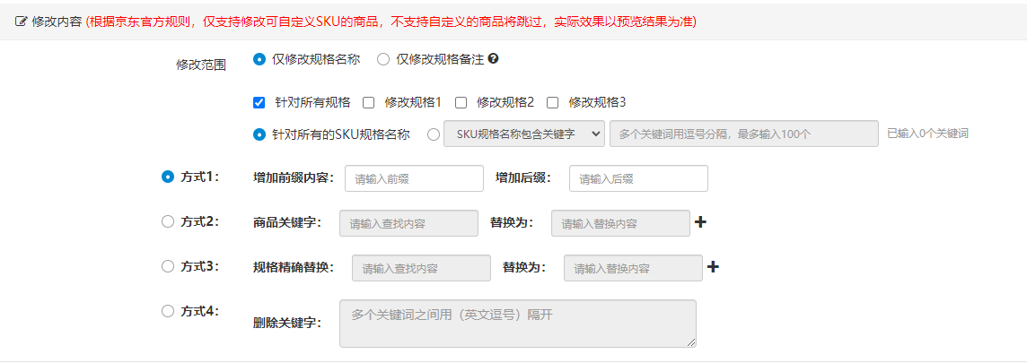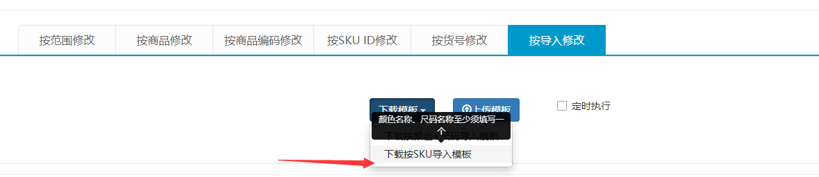 主要分为:按范围修改;按商品修改;按商品编码修改;按skuid修改;按货号修改;按导入修改