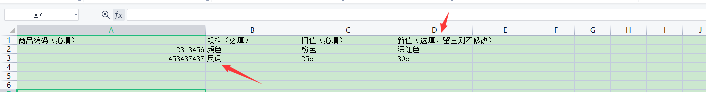 1.下载按颜色+尺码导入模板,其中规格的值必须是写颜色或者尺码,如下图例子所示