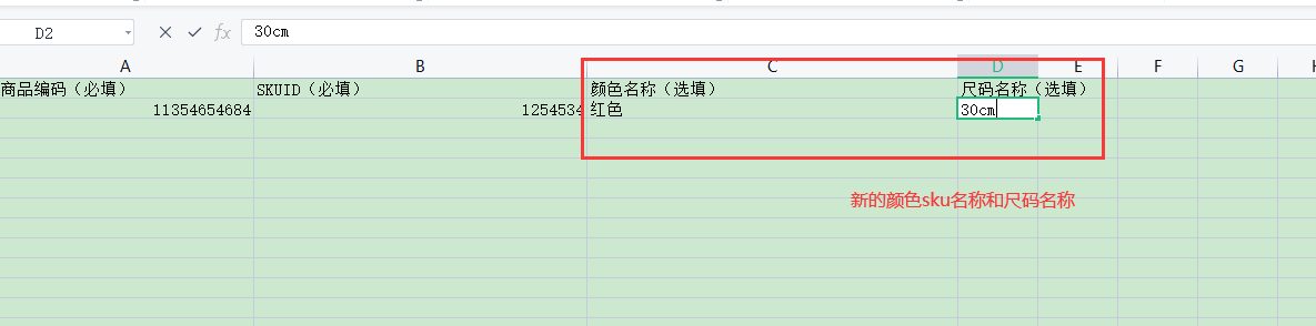 2.下载按sku导入模板,颜色和尺码名称至少要填写一项,如下图例子所示