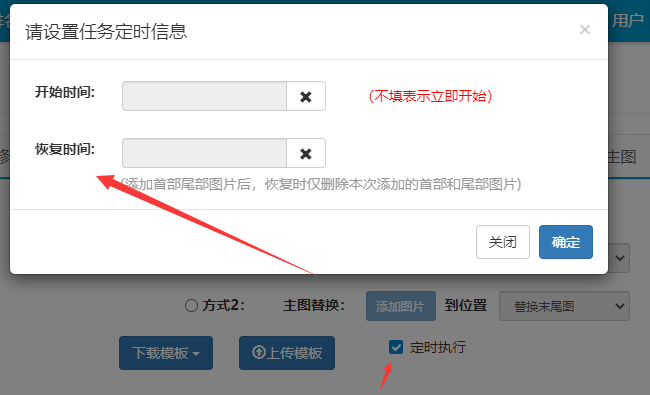 有定时执行任务需求的,可以勾选定时执行,设置开始和恢复时间,系统会在设置的开始时间到了的时候,修改您的商品,等恢复时间到了,系统又会将恢复成修改前的样子哦。