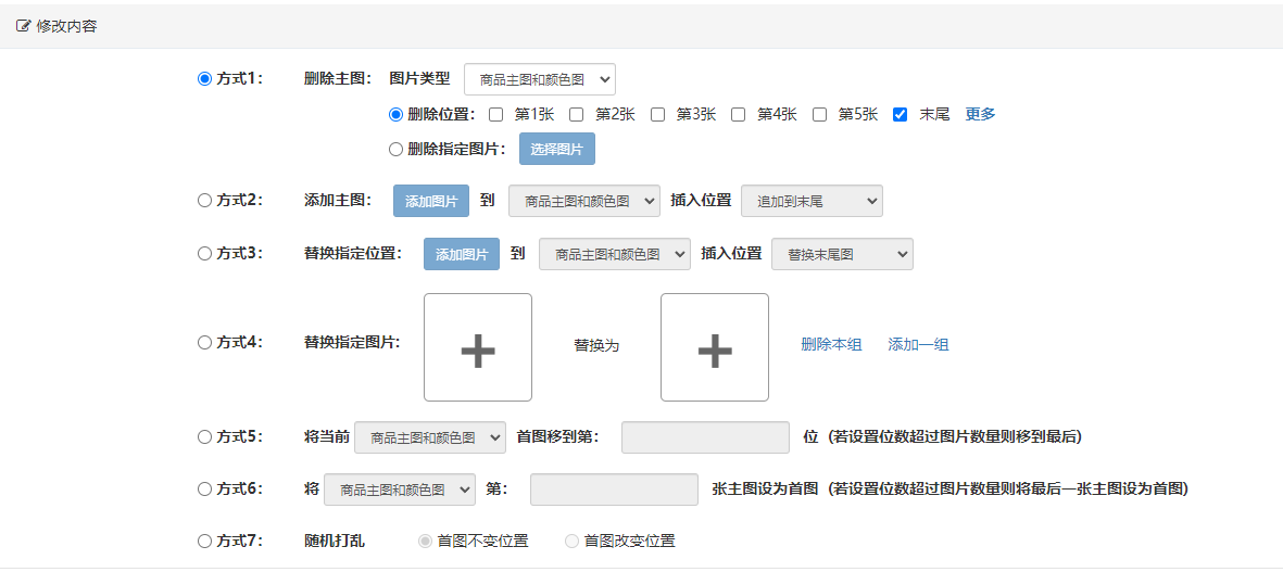 方式3:主图替换,即选定某一张图片,批量替换掉商品主图或颜色图的某个指定位置的图片。
