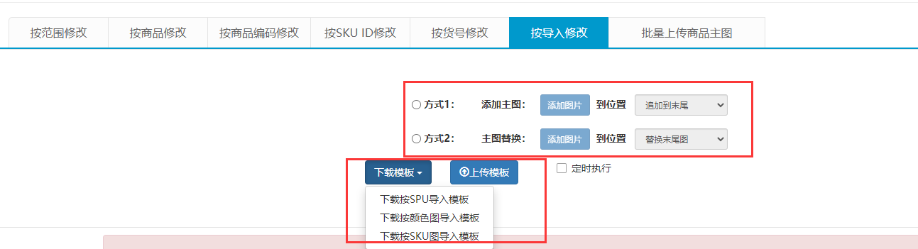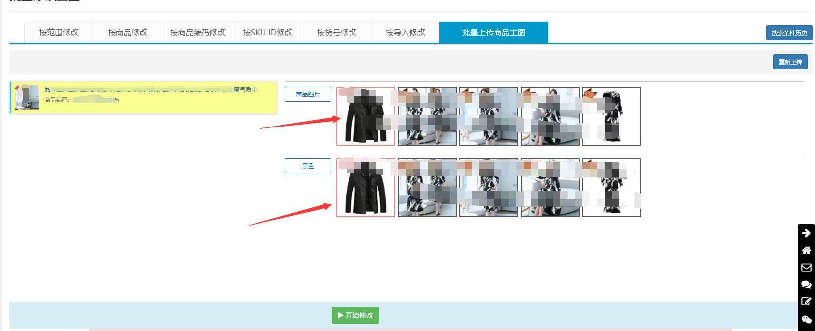 主要分为:按范围搜索;按商品搜索;按商品编码搜索;按SKUID搜索;按货号搜索;按导入修改以及批量上传商品主图
