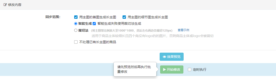 最后商品选好了,修改方式选好,就可以点击效果预览,可以预览修改前后商品的样子,确认无误的话,就可以点击开始修改了。