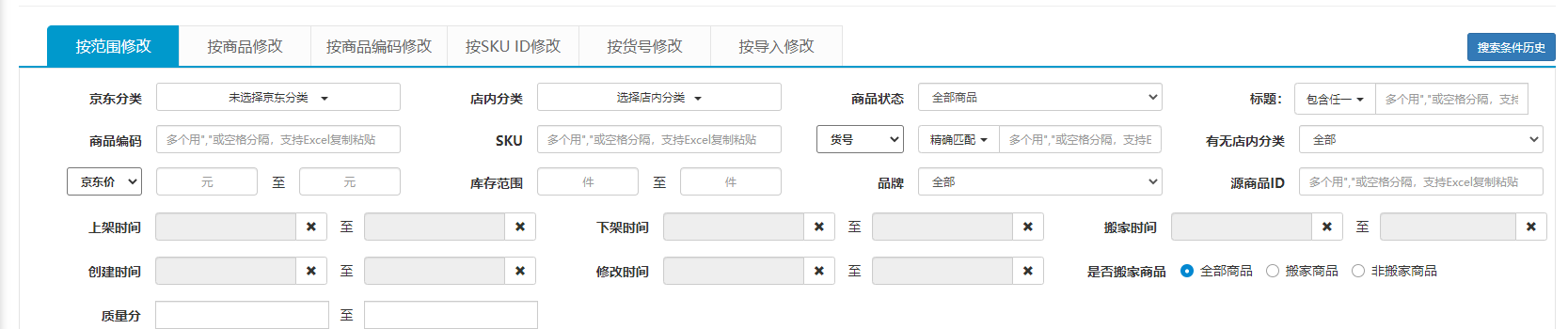 主要分为:按范围修改;按商品修改;按商品编码修改;按skuid修改;按货号修改;按导入修改。