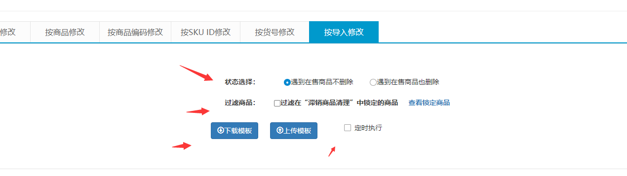 主要分为:按范围修改;按商品修改;按商品编码修改;按skuid修改;按货号修改;按导入修改。