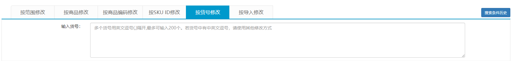 有使用erp,经常使用货号来搜索商品,这个功能就满足需求,系统只会搜索并修改输入的这些货号的商品。