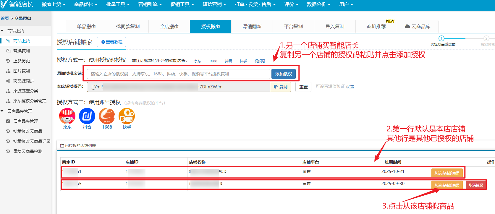 回到去复制的店铺,打开智能店长,粘贴被复制的店铺智能店长授权码,点击添加授权即可;