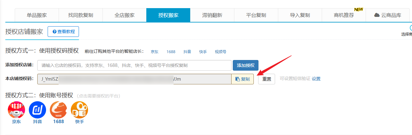 如下图所示,需要授权复制哪个平台的店铺商品,则点击对应的平台