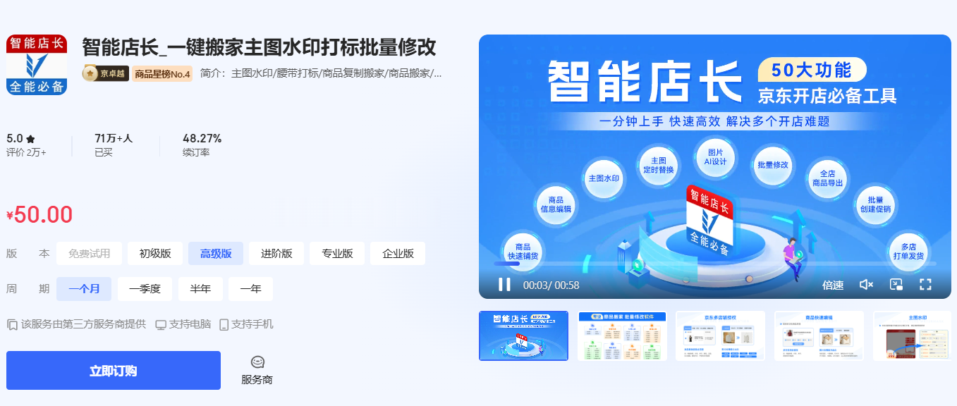 两个店铺从京东服务市场订购智能店长(至少要高级版,初级版不支持授权复制功能)