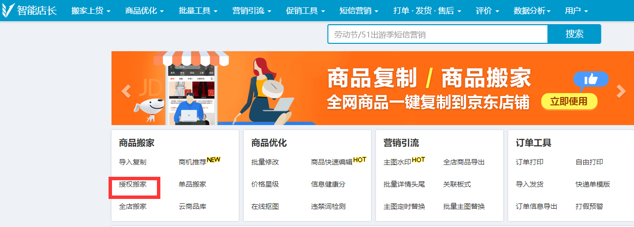 在订购京东服务市场智能店长应用后,被复制的店铺进入京东智能店长首页 在商品模块选择授权搬家,如下图所示