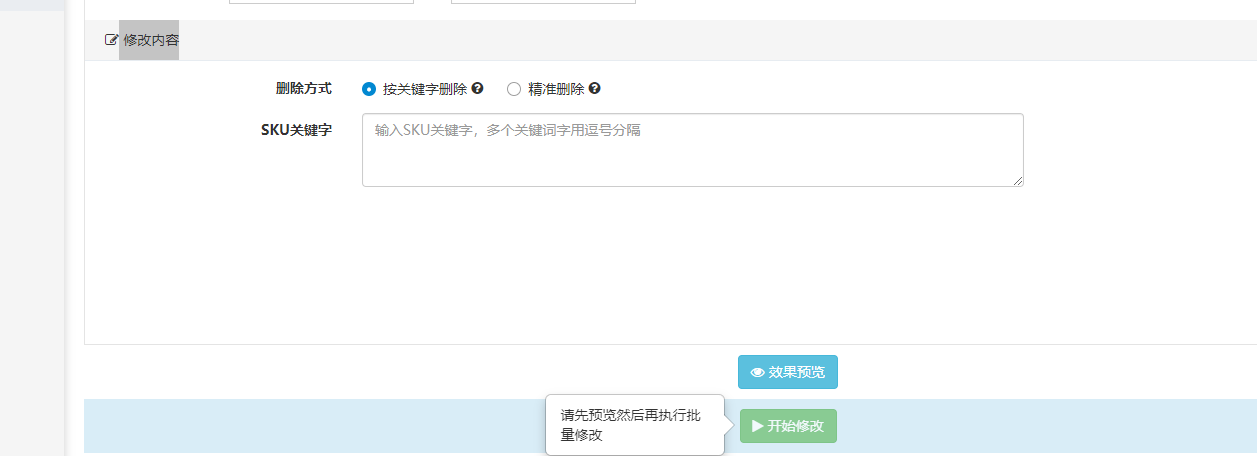 (1)按关键词删除:只要在sku别名搜索框中,搜索sku名称(颜色以及尺码均算在内)中存在指定的关键词,则对应的sku会被识别删除,假设说一个sku名称:青花瓷30年款,您sku别名搜索中只输入了青花瓷三个字,只要含有该三个字的,都会被删除。