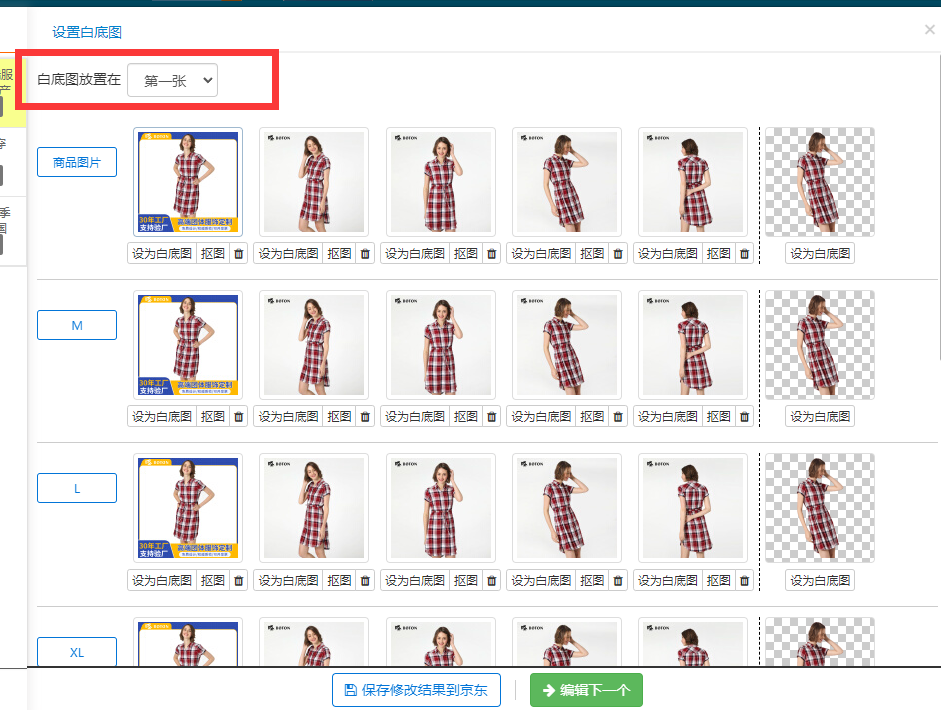 勾选商品,点击一键设置白底图后,进入设置页面,默认设置第一张,可按需选择,最后点击保存修改结果到京东