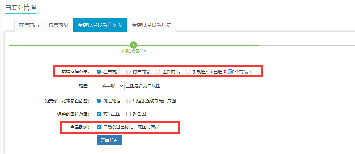 (2)默认是选择第一张进行生成,可自行设置选择不同位置的商品图生成白底图,其他设置按个人需要选择,最后点击开始任务便可