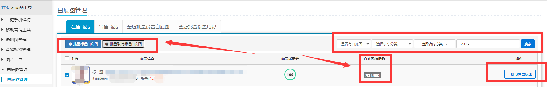 注意:批量标记的作用:批量标记是商家在设置了白底图后可以标记已生成白底图,方便后续区别,以及全店设置商品白底的时候,跳过已设置过的。