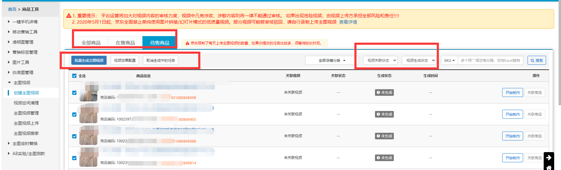 点击批量生成主图视频,最后耐心等待生成并且京东审核通过就好了。需要时间哈