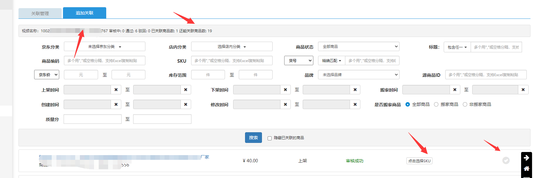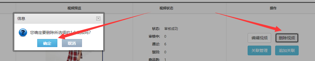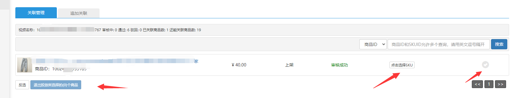 点击管理对已经关联在视频中的sku进行取消的操作;点击追加关联,则可以给视频新增关联商品