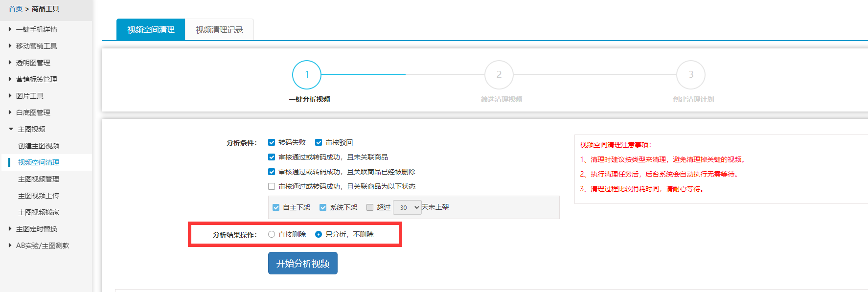 按需选择------分析结果操作(1)直接删除(2)只分析,不删除----选择后点击开始分析,系统就会进行视频的数据读取,需耐心等待