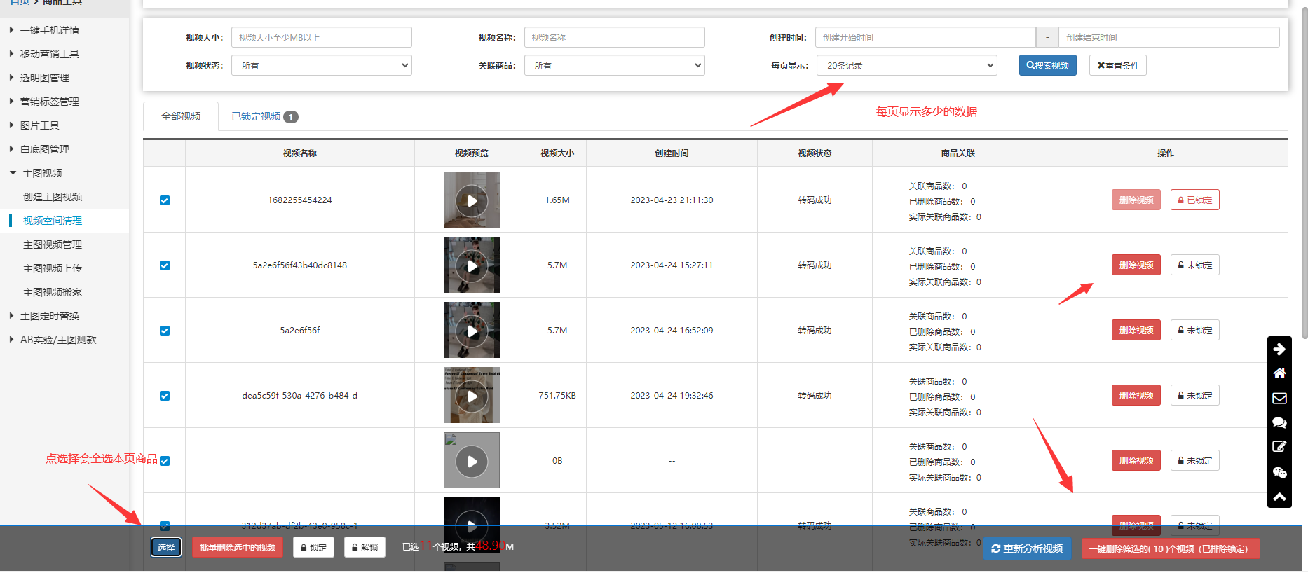 分析出来后,可单选或者多选主图视频,点击删除就可删除掉视频内容,如果有一些视频很重要您怕被检测误删,可以锁定起来,软件对锁定的视频不会删除;