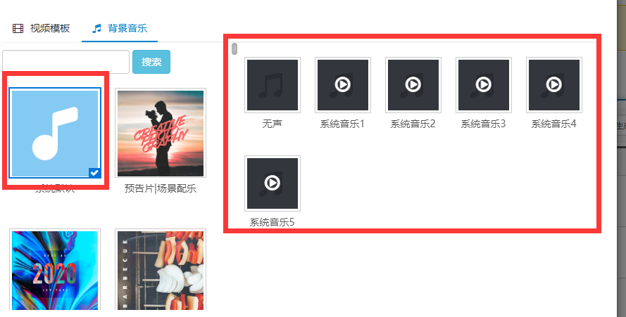 (注意:背景音乐中的系统默认是我们软件有版本可直接使用的,其他配乐目前京东允许使用)