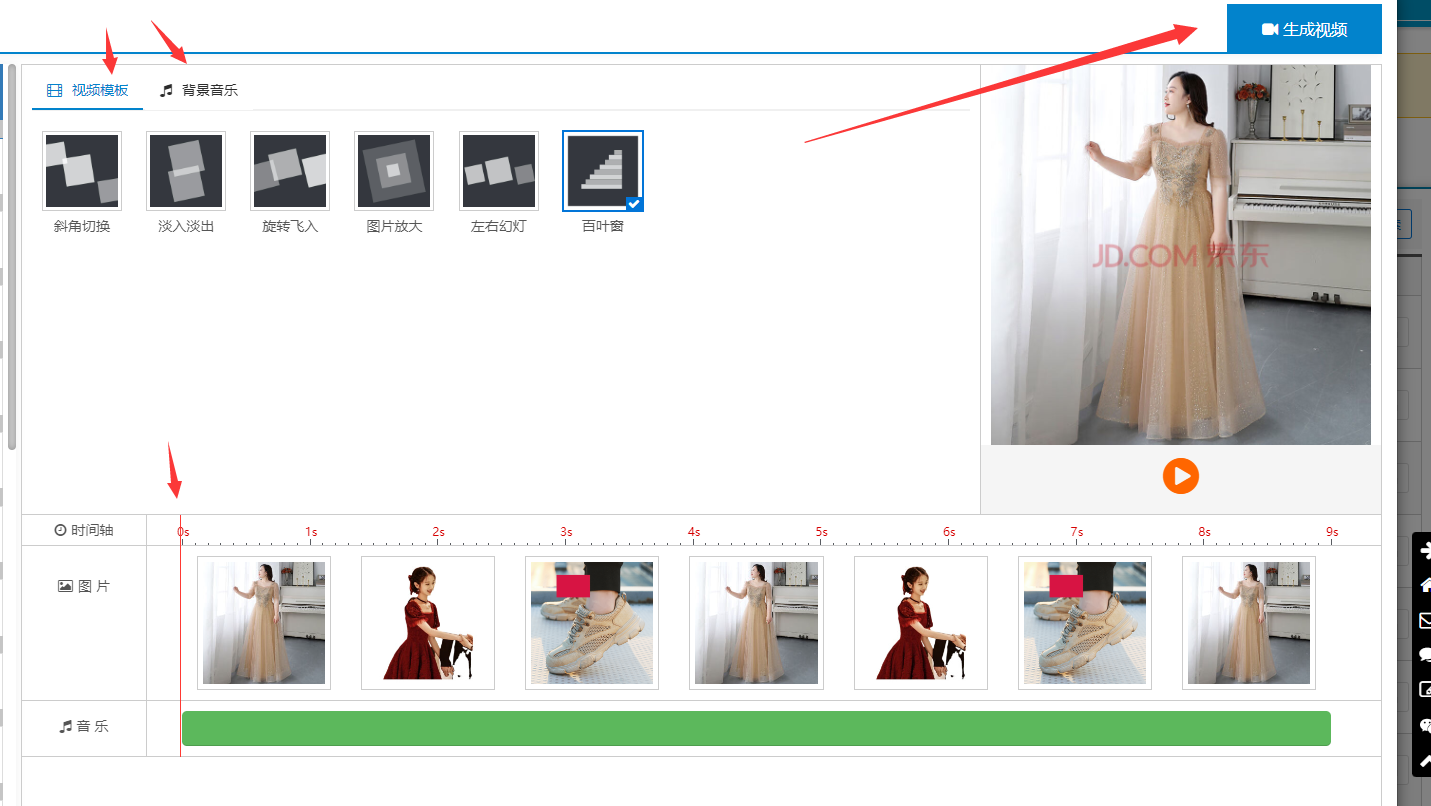 步骤: 勾选商品并且点击开始制作---设置模板和背景音乐---点击生成视频后等待生成以及京东审核。