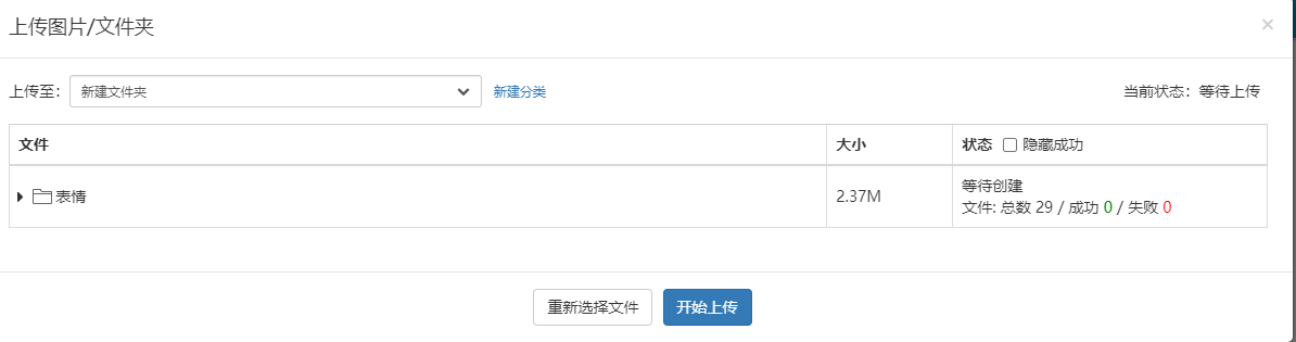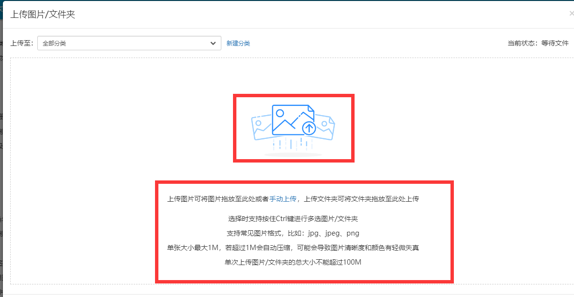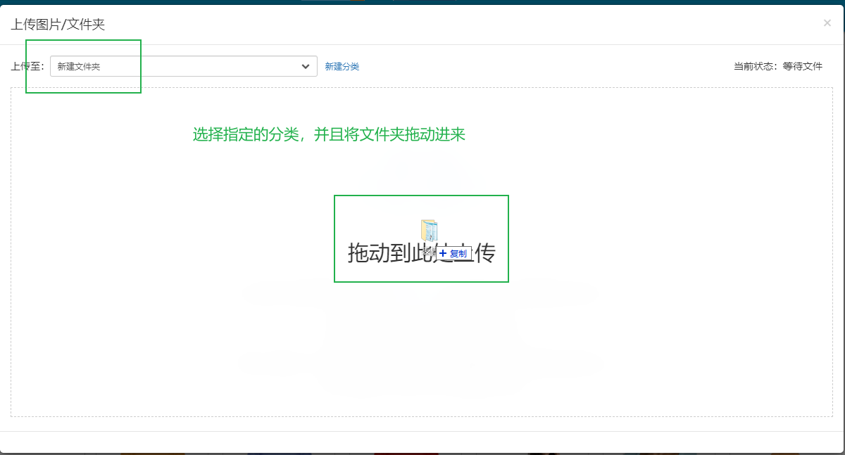 批量上传图片/文件夹:可以单独拖动上传某一张图到指定的分类中,或者先创建一个文件夹,在文件夹中放入多张图片