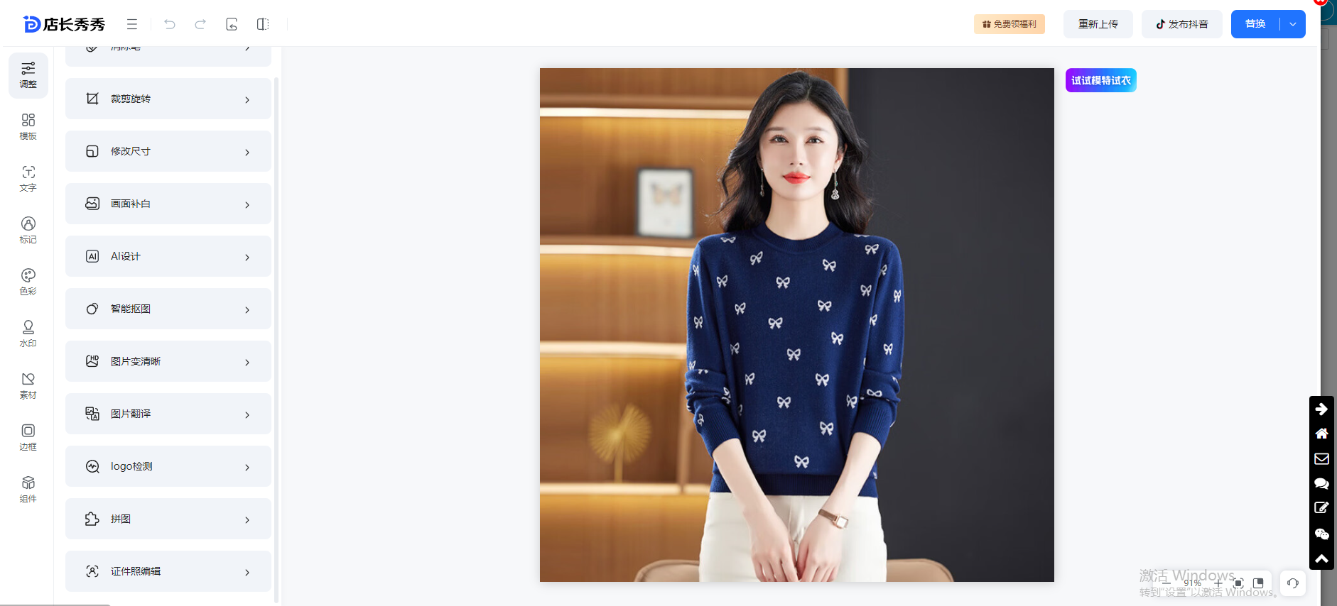 ①调整业务:消除笔、裁减旋转、修改尺寸、画面补白、智能抠图、AI设计、图片清晰、拼图等