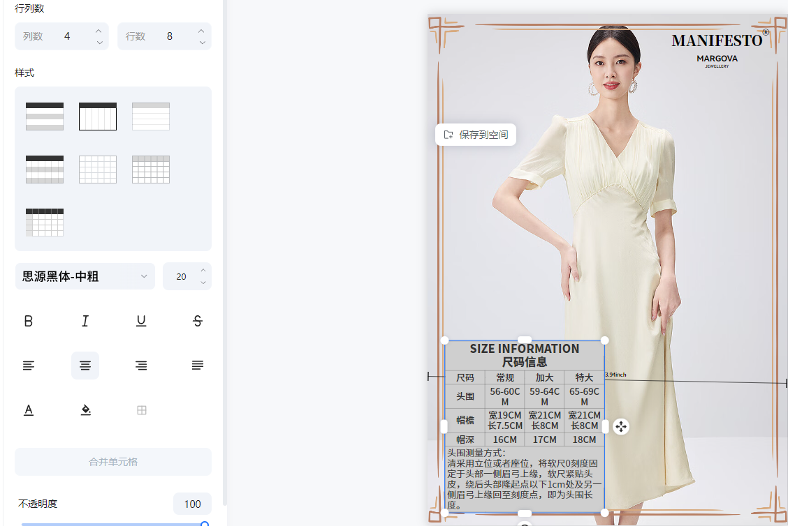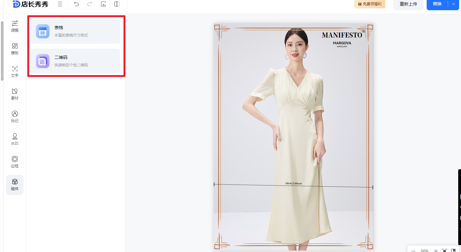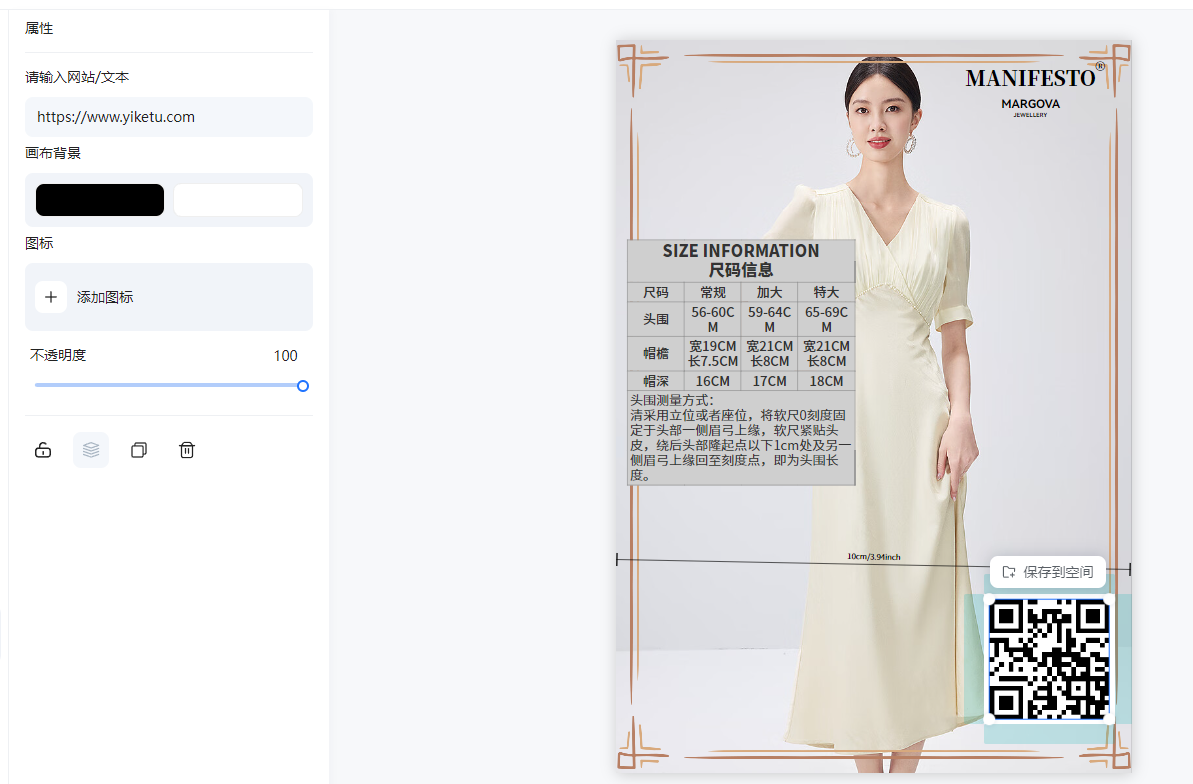 ⑧组件:支持设置表格(如尺码表,可以快速审查尺码表并且支持自定义表格内容)和二维码(二维码可以添加链接)