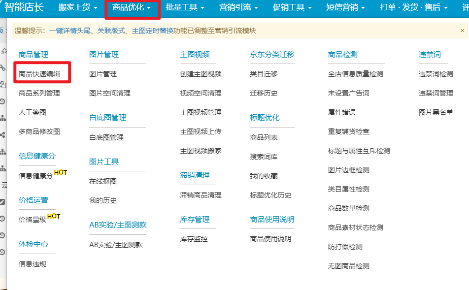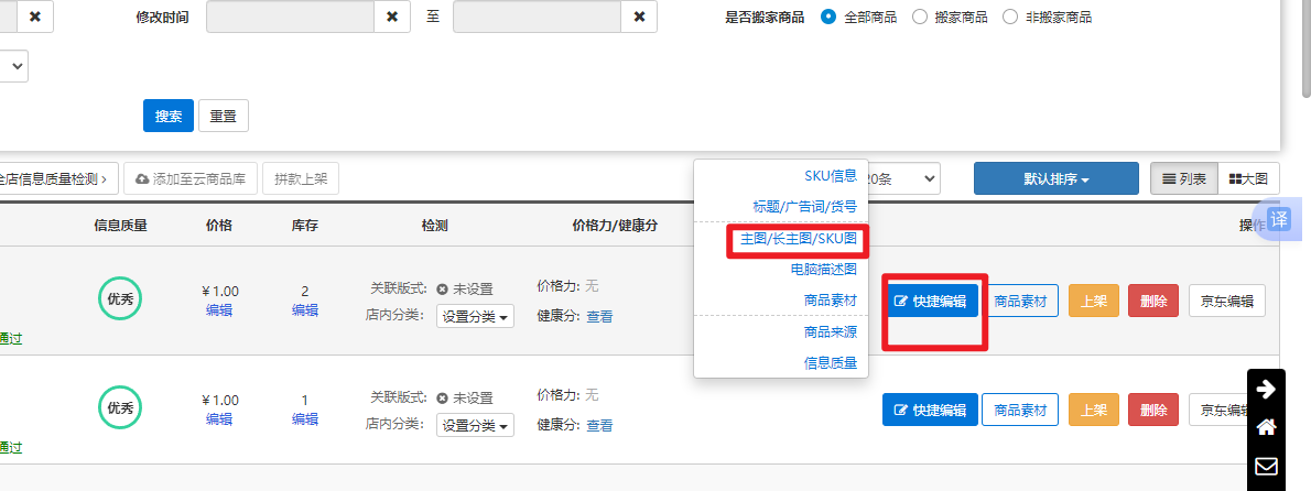 路径:商品优化--商品快速编辑--选择一个商品点击快捷编辑按钮