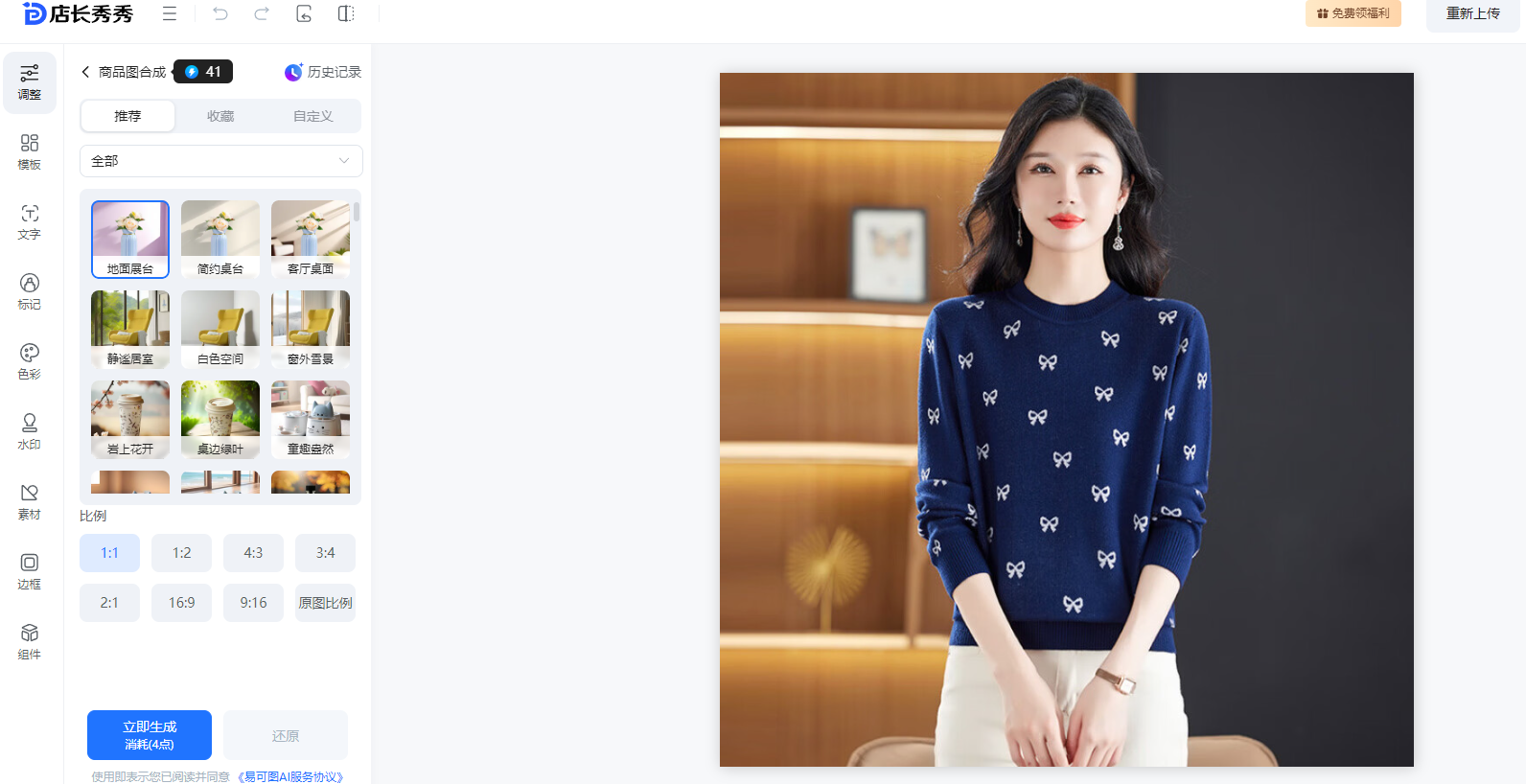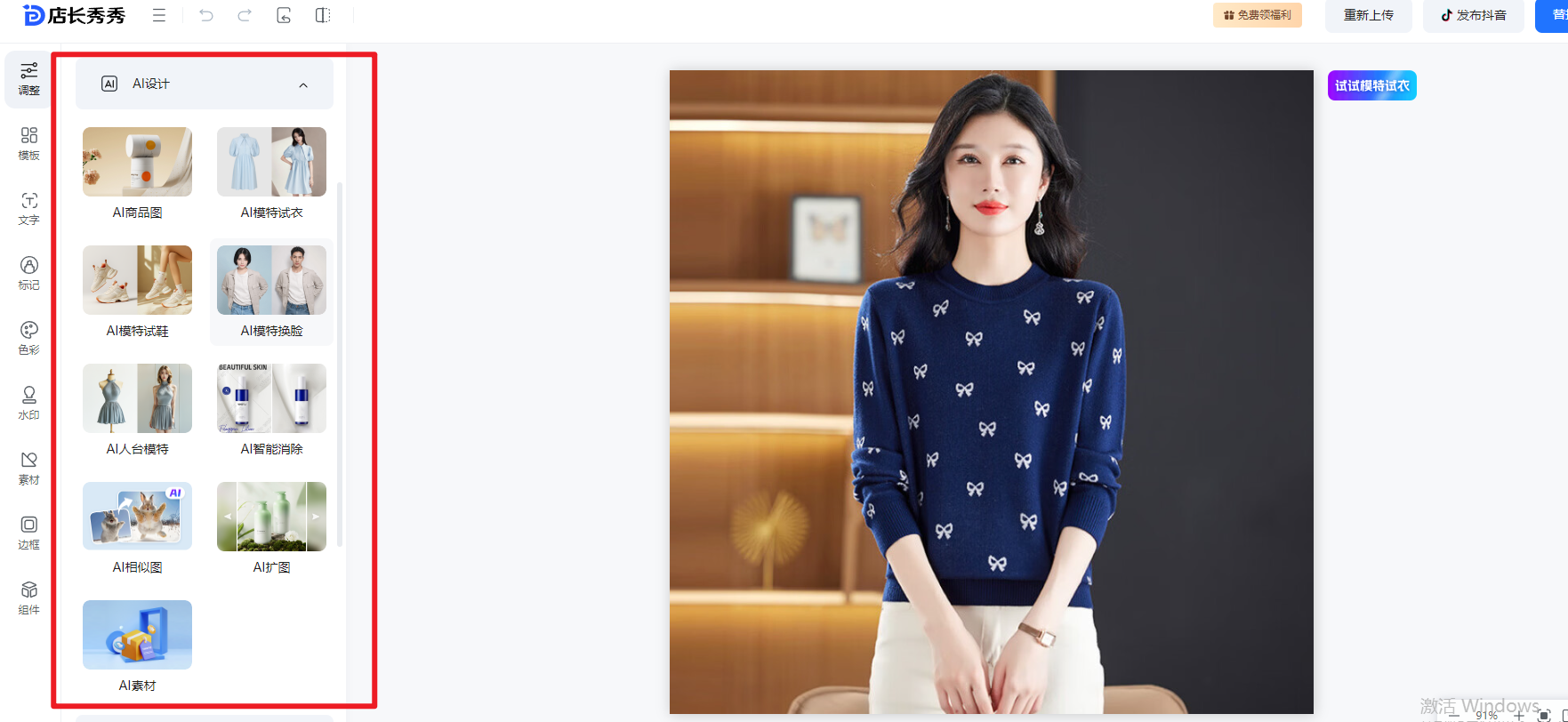 AI设计(AI商品图、AI模特试衣、AI扩图、AI万能改图、AI手持商品、AI姿势裂变、AI万物穿戴、AI模特换脸、AI模特换鞋、AI 模特换脸、AI智能消除水印、AI文生图、AI商品换色、AI图片裂变、AI局部重绘、AI人台模特、AI商品营销图)