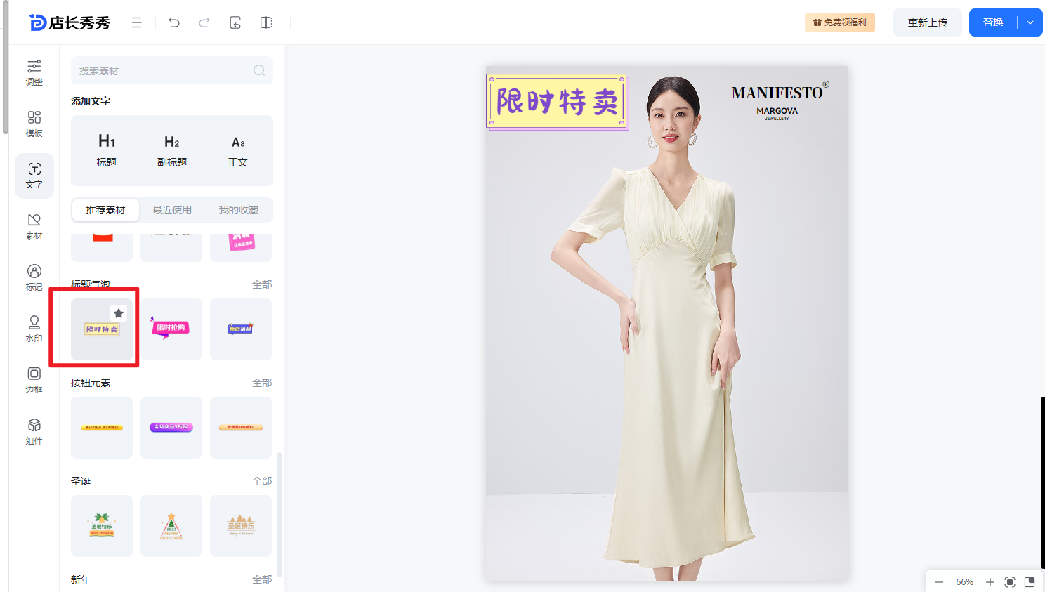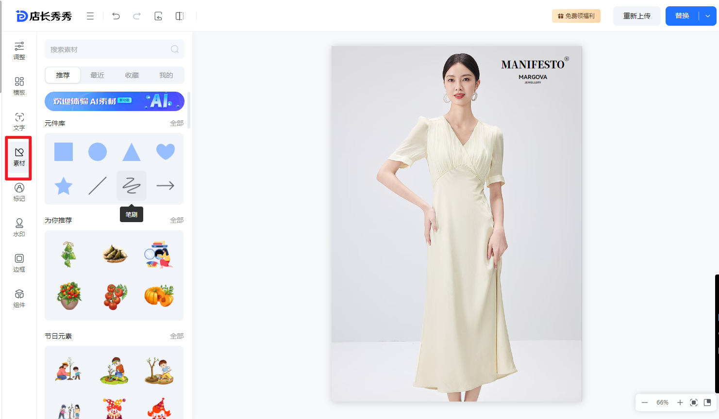 ④素材:系统准备了元件库、节日元素、图标、箭头等素材图供大家选择使用,同时也支持大家自行上传本地素材图用于编辑