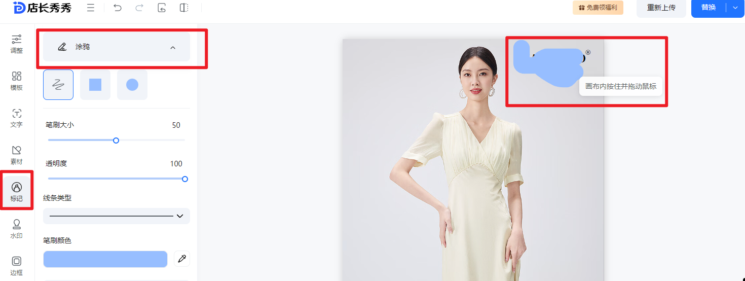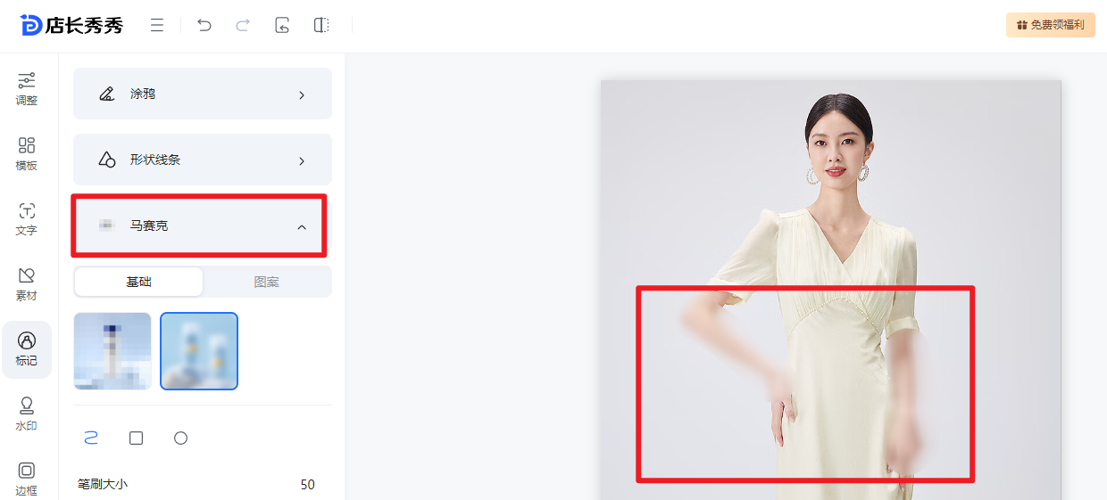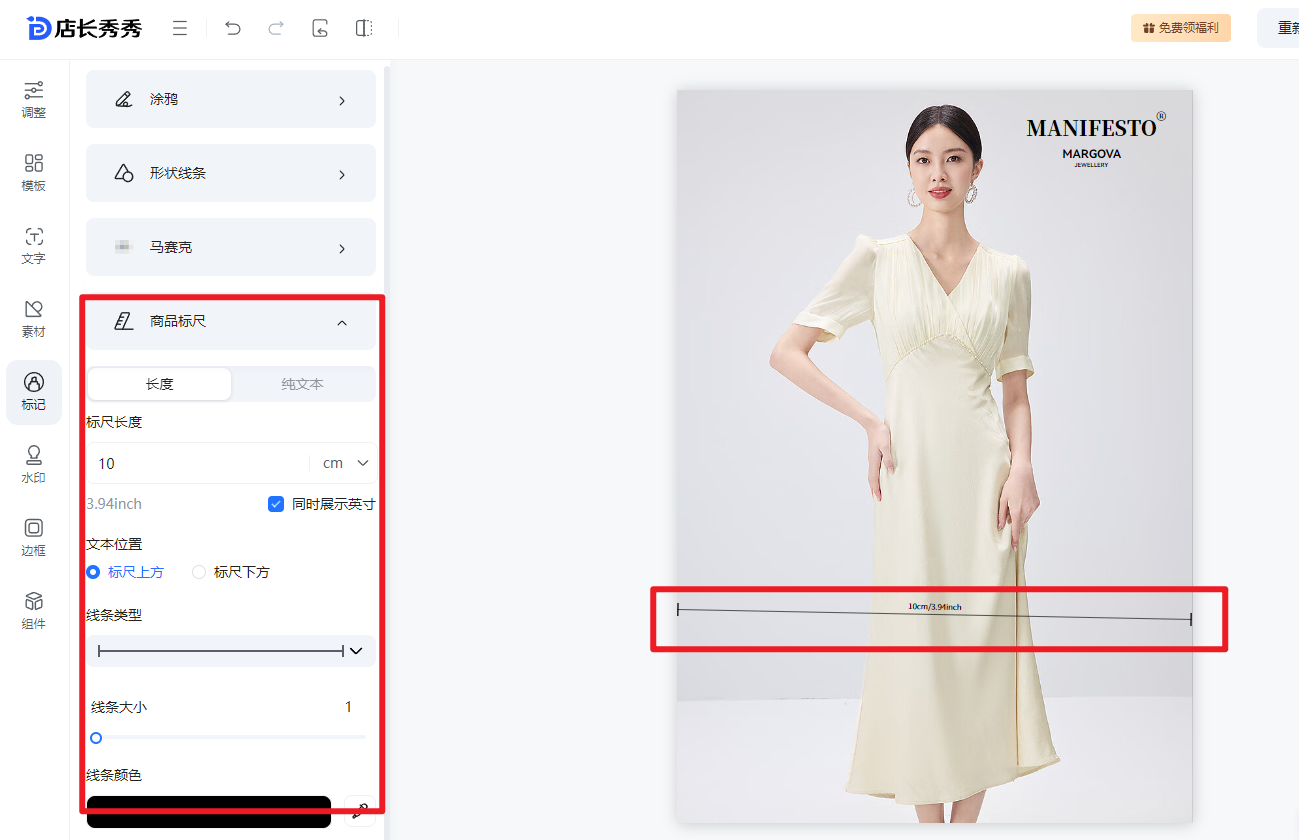 ⑤标记: 提供了诸如涂鸦、形状线条、马赛克以及商品标尺的功能