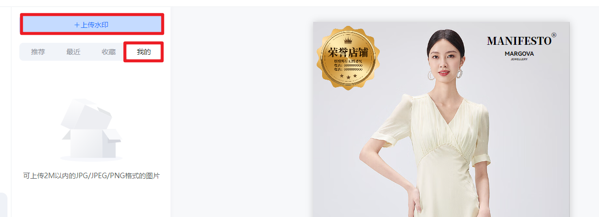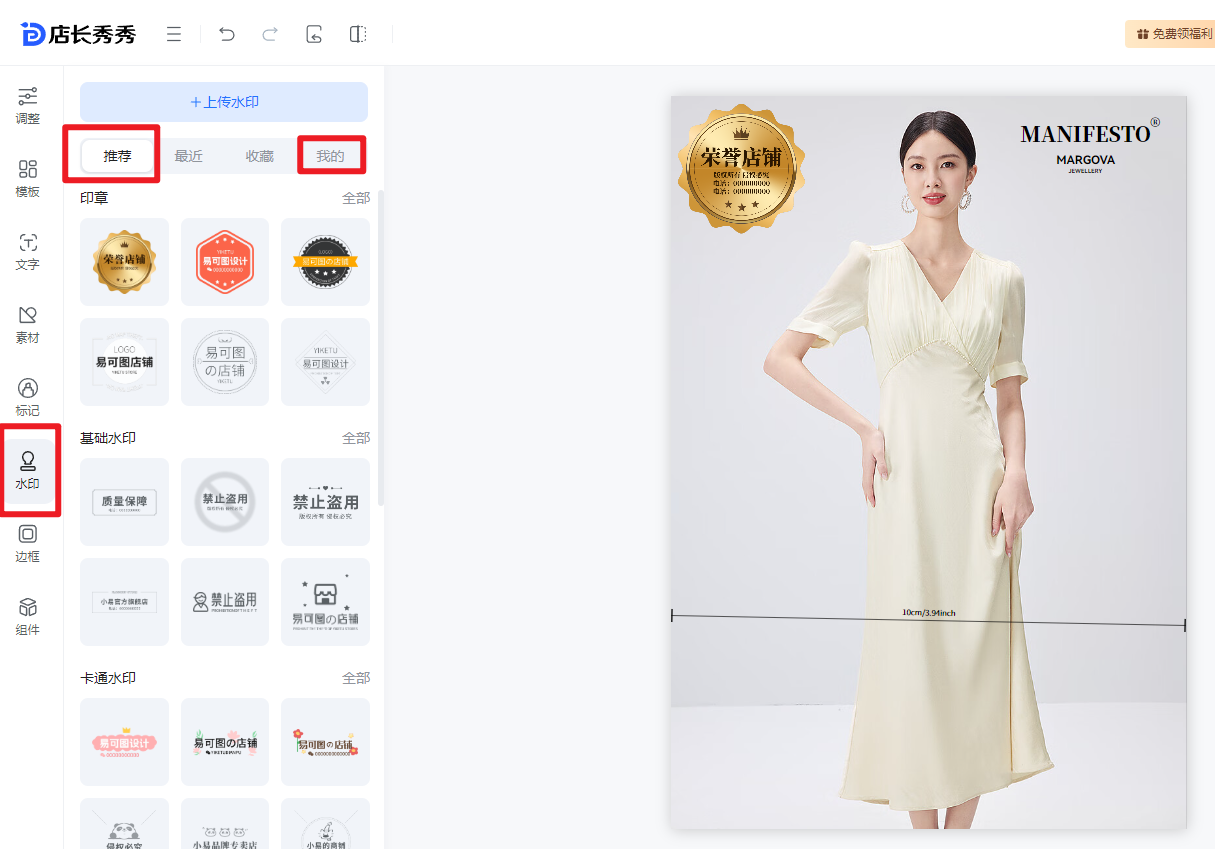 ⑥水印:软件提供了印章、基础水印、卡图水印、行业水印等素材,商家也可以点击--我的--上传自己的水印图进行合成编辑