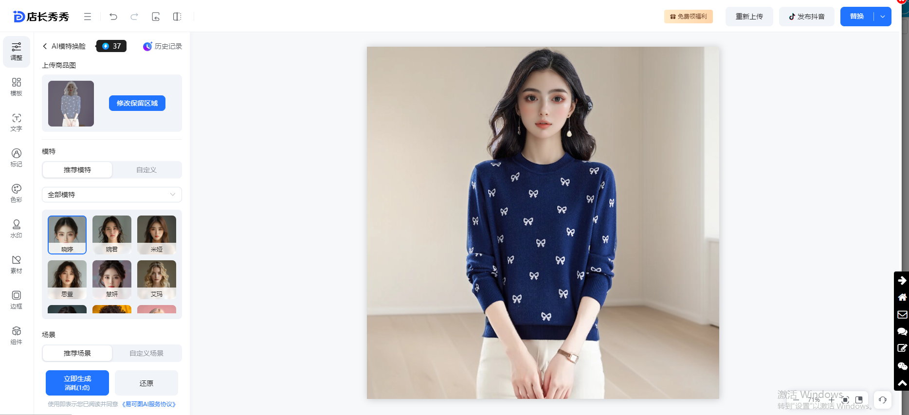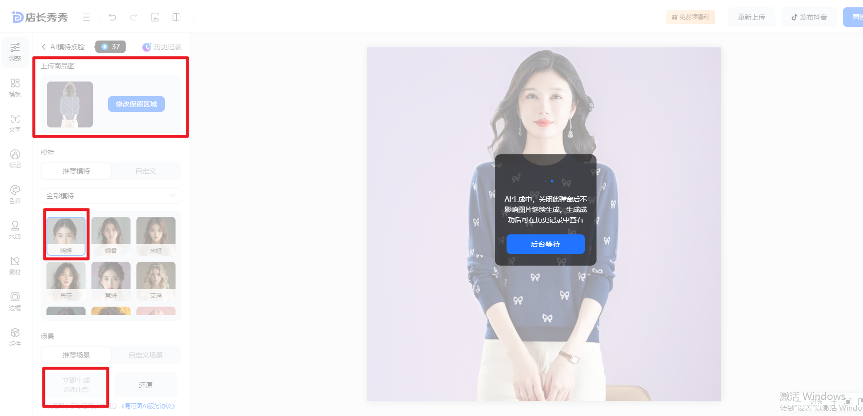 先选择需要保留的内容区域(一般情况下脸部不会做保留),然后选择模特,除了系统自带的,商家可自定义上传模特脸图