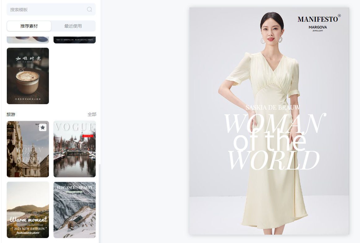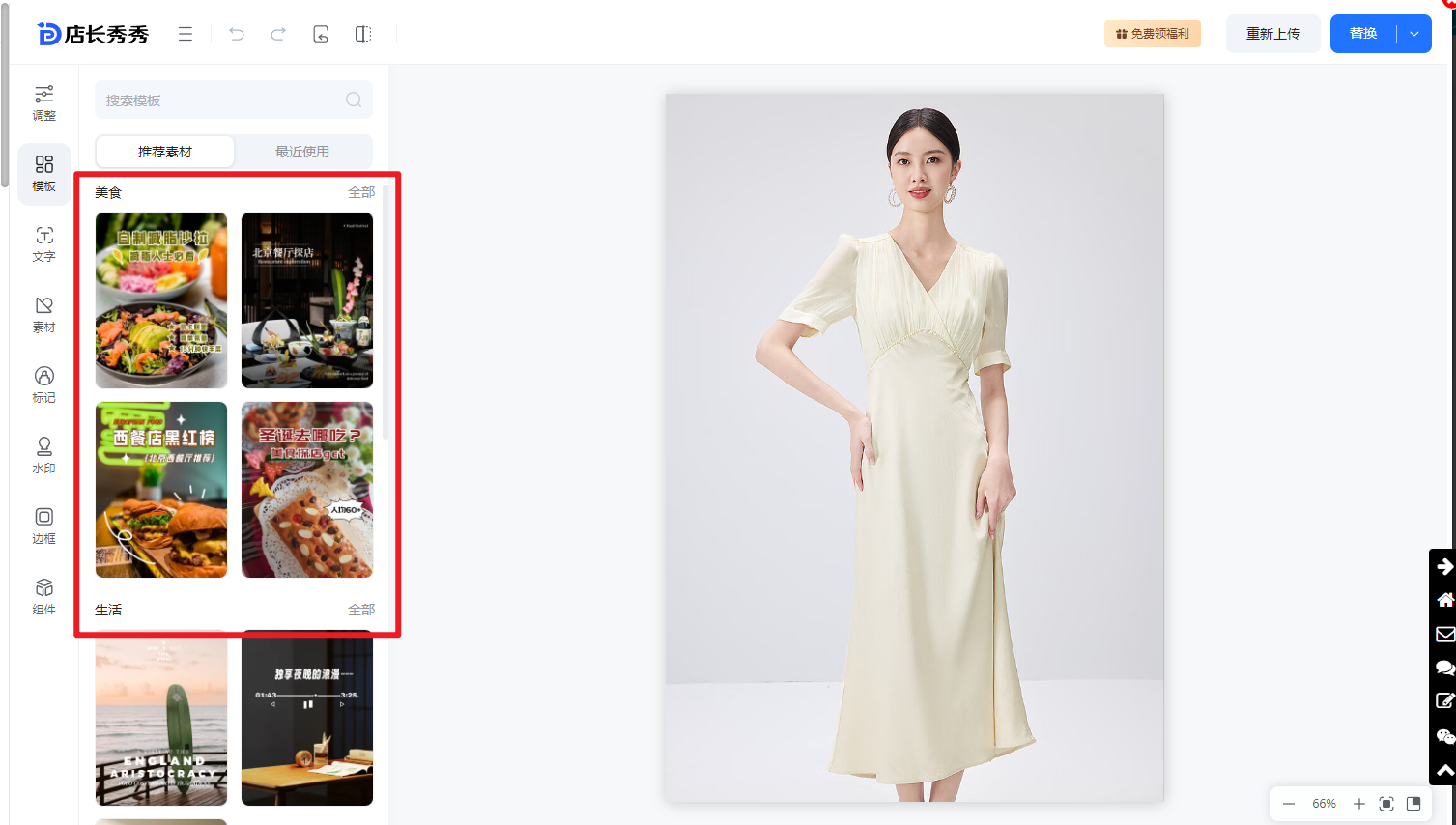 ②模版:系统提供了以美食、生活、旅游等元素的水印素材,帮忙美化图片