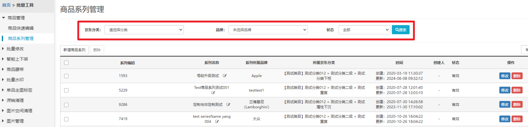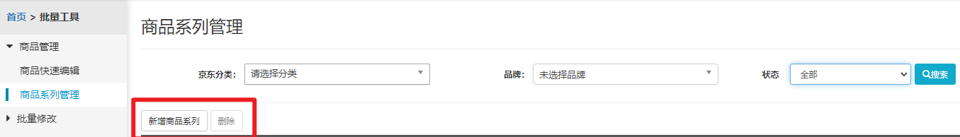 可通过筛选京东分类/品牌/状态 来筛选已创建的系列品