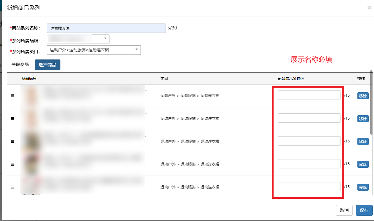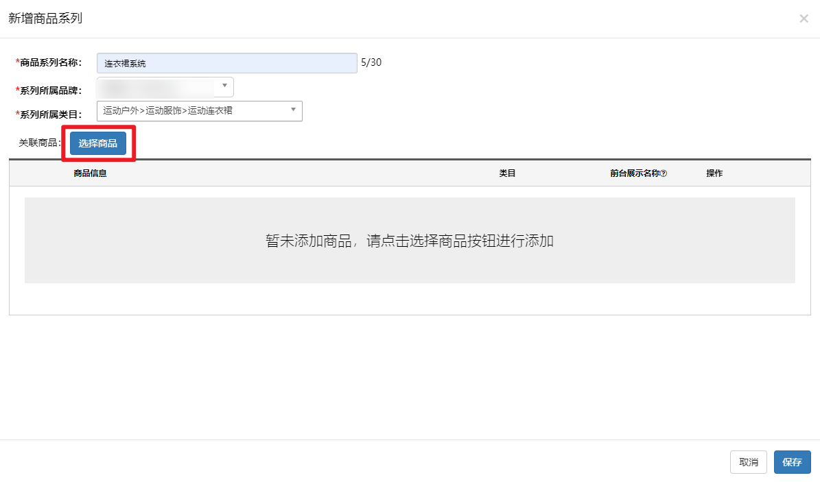 选择新增商品系列--填写商品系列品名称/品牌/系列所属类目--选择商品(所选商品属于同一个类目)